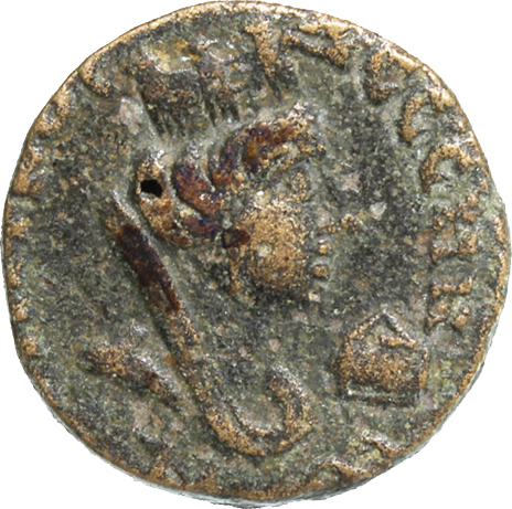 turreted and draped bust of the Tyche of the City, right; to right, small temple with pediment