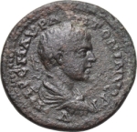 laureate, draped and cuirassed bust of Elagabalus, right, seen from rear