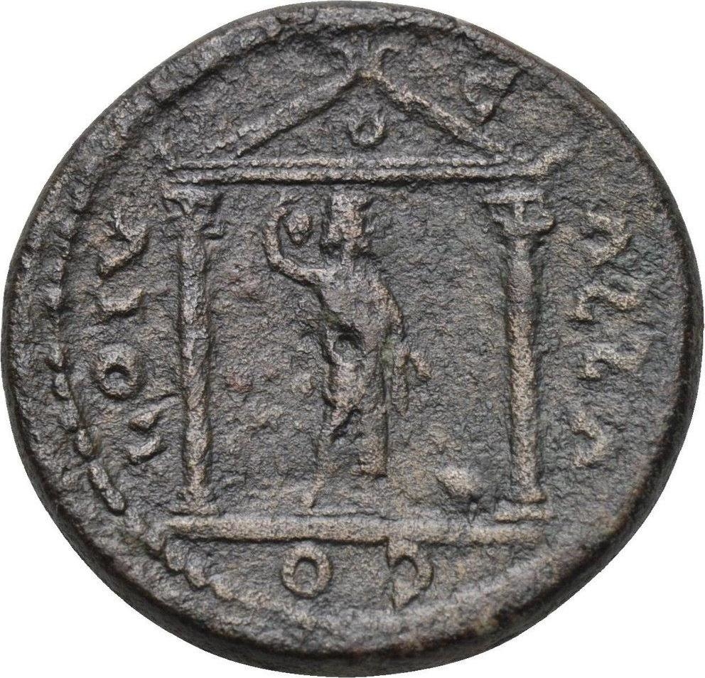 Front view of temple with two columns, within which Zeus Ammon stands, right, holding bunch of grapes; behind, serpent; before, crane; globe in pediment