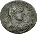 laureate, draped and cuirassed half-length bust of Severus Alexander, right, holding eagle-tipped sceptre on shoulder and decorated shield, seen from front