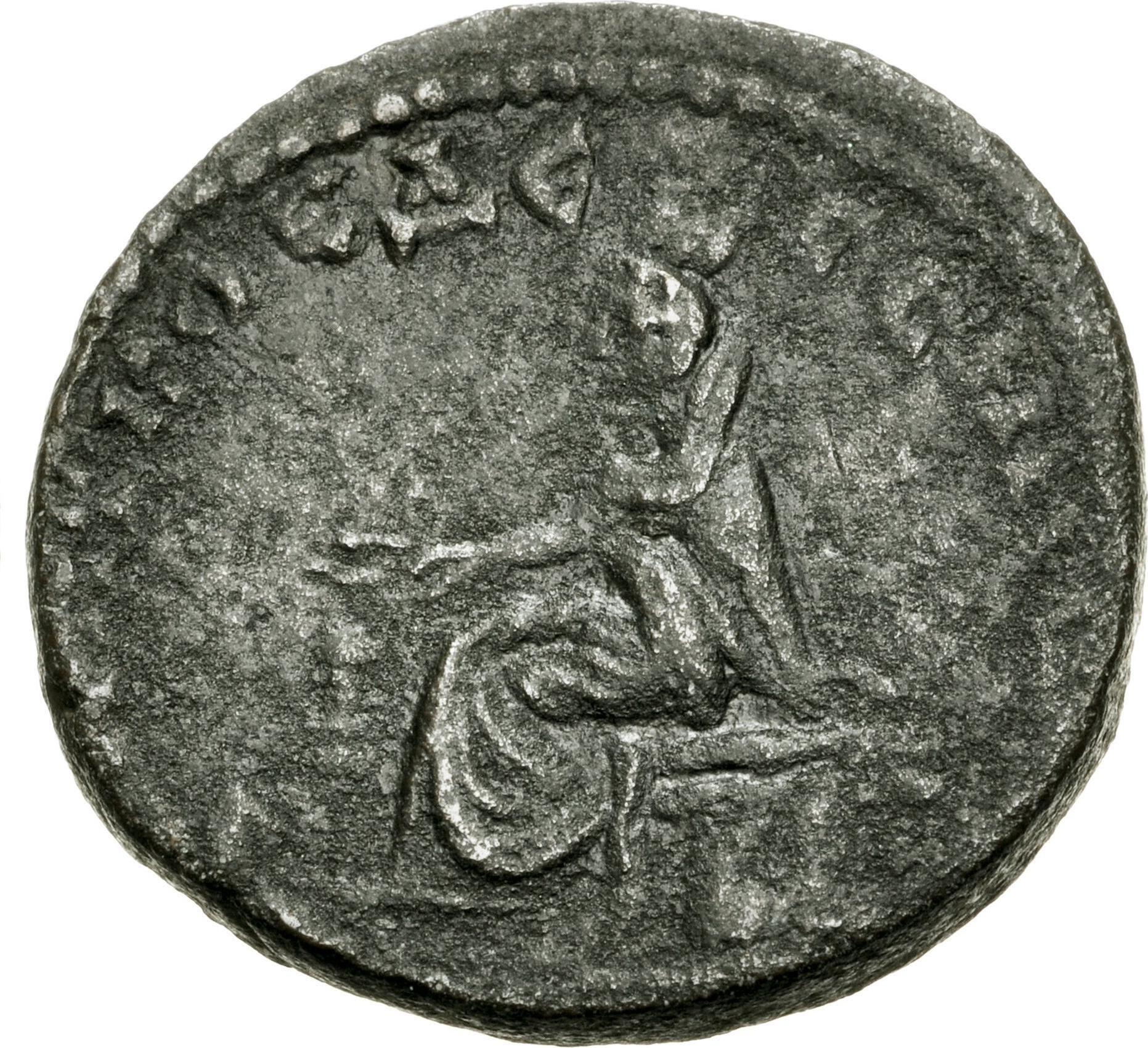 Tyche of the City seated on basis, left, holding corn ears; at her feet, lighted altar; below, river god swimming, left