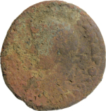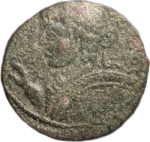 Tyche of the City seated on basis, left, holding corn ears; at her feet, lighted altar; on either side, star; below, river god swimming, right