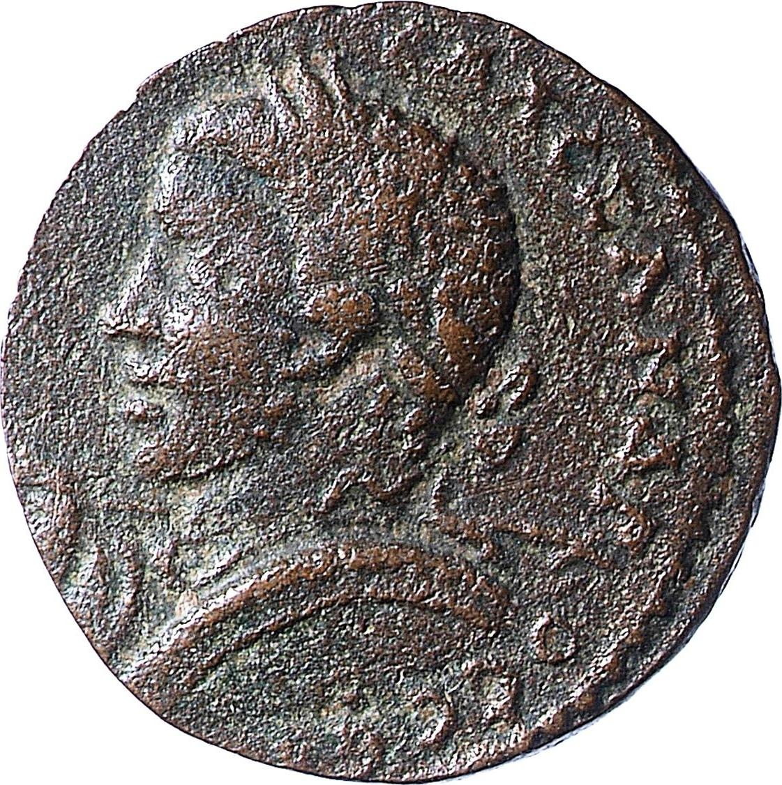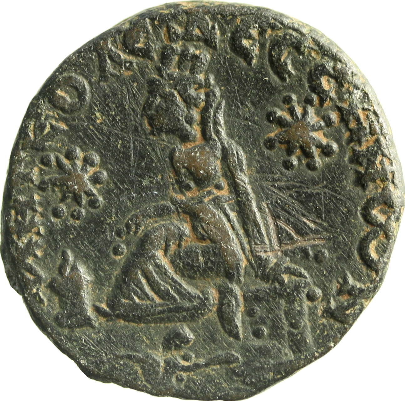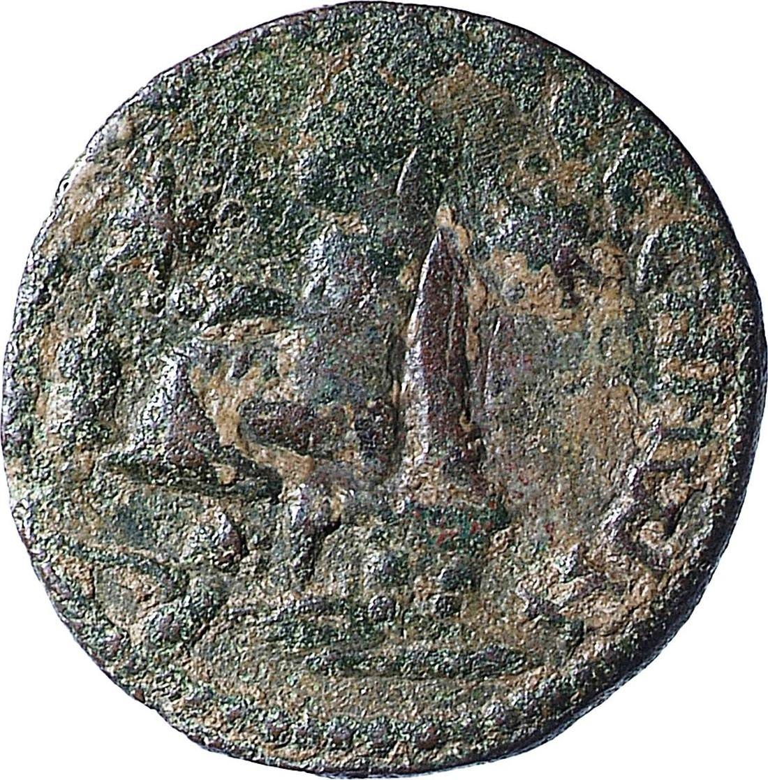 Tyche of the City seated on basis, left, holding corn ears; at her feet, lighted altar; on either side, star; below, river god swimming, right