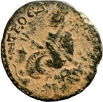 Tyche of the City seated on rock, left, holding corn ears; at her feet, lighted altar; below, river god swimming, left