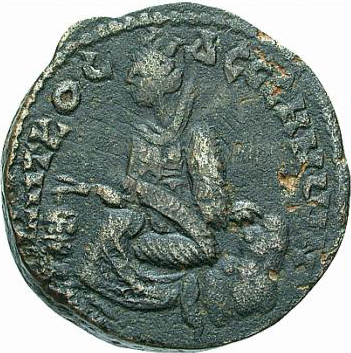 Tyche of the City seated on rock, left, holding corn ears; at her feet, lighted altar; below, river god swimming, right