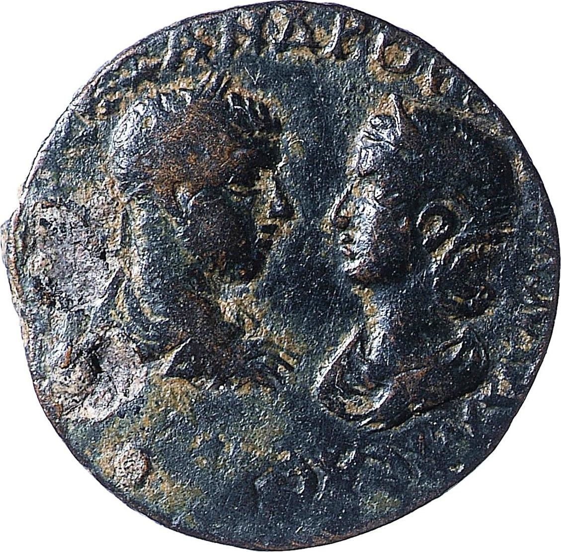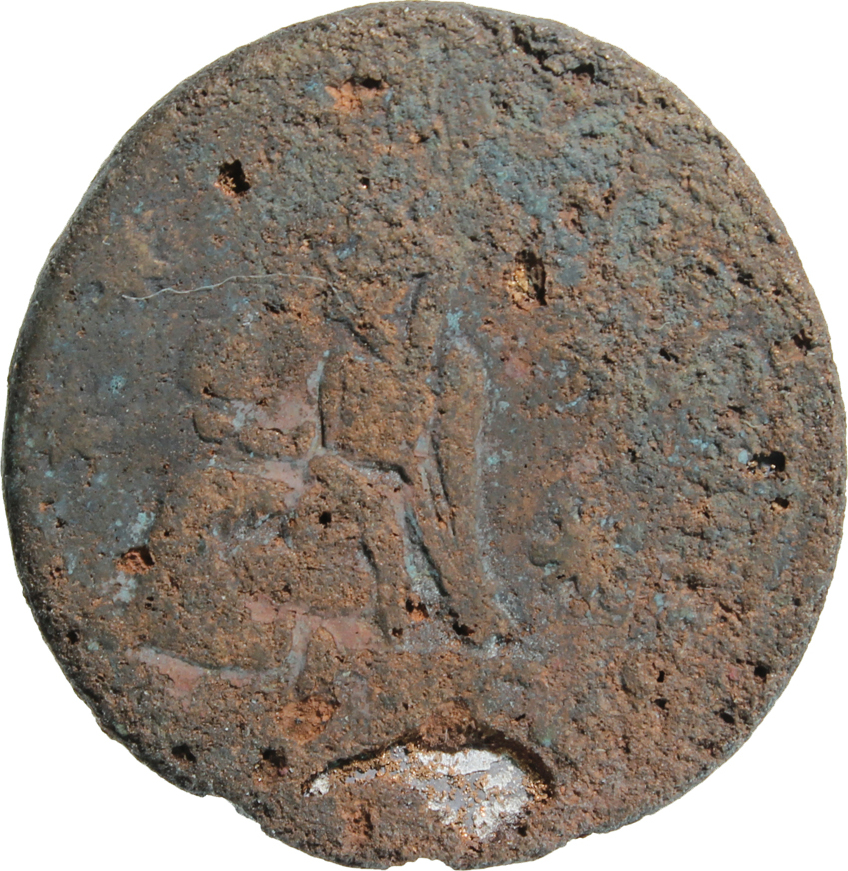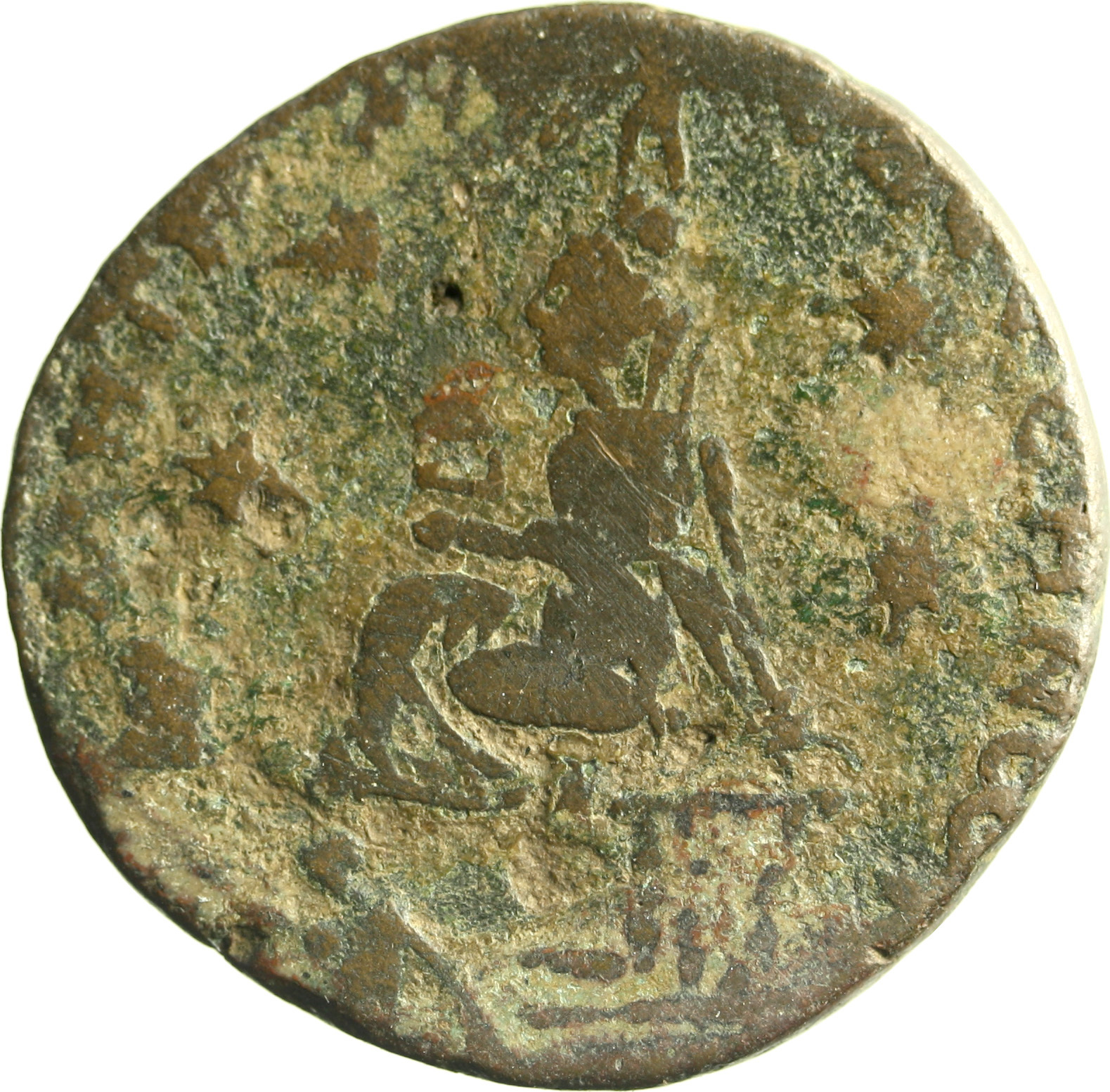 Tyche of the City seated on basis, left, holding small temple with pediment; on her crown, Aquarius(?) standing facing, holding water-skin over shoulder; at her feet, lighted altar; on either side, two stars; below, river god swimming, left |