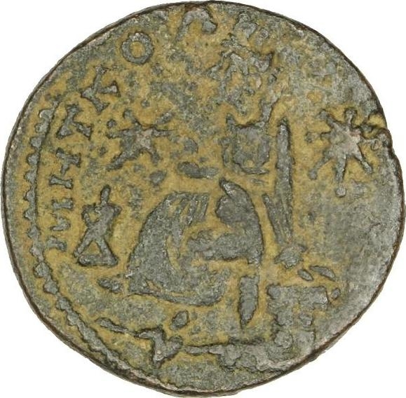 Tyche of the City seated on basis, left, holding grains; on her crown, Aquarius(?) standing facing, holding water-skin over shoulder; at her feet, lighted altar; on either side, star; below, river god swimming, right