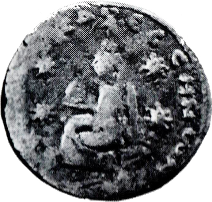 Tyche of the City seated on basis, left, holding small temple with pediment; on her crown, Aquarius(?) standing facing, holding water-skin over shoulder; at her feet, lighted altar; on either side, two stars; below, river god swimming, left |