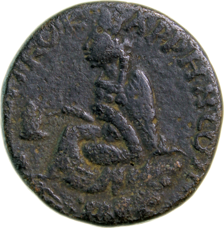 Tyche of the City seated on rock, left, holding corn ears; at her feet, lighted altar; below, river god swimming, left