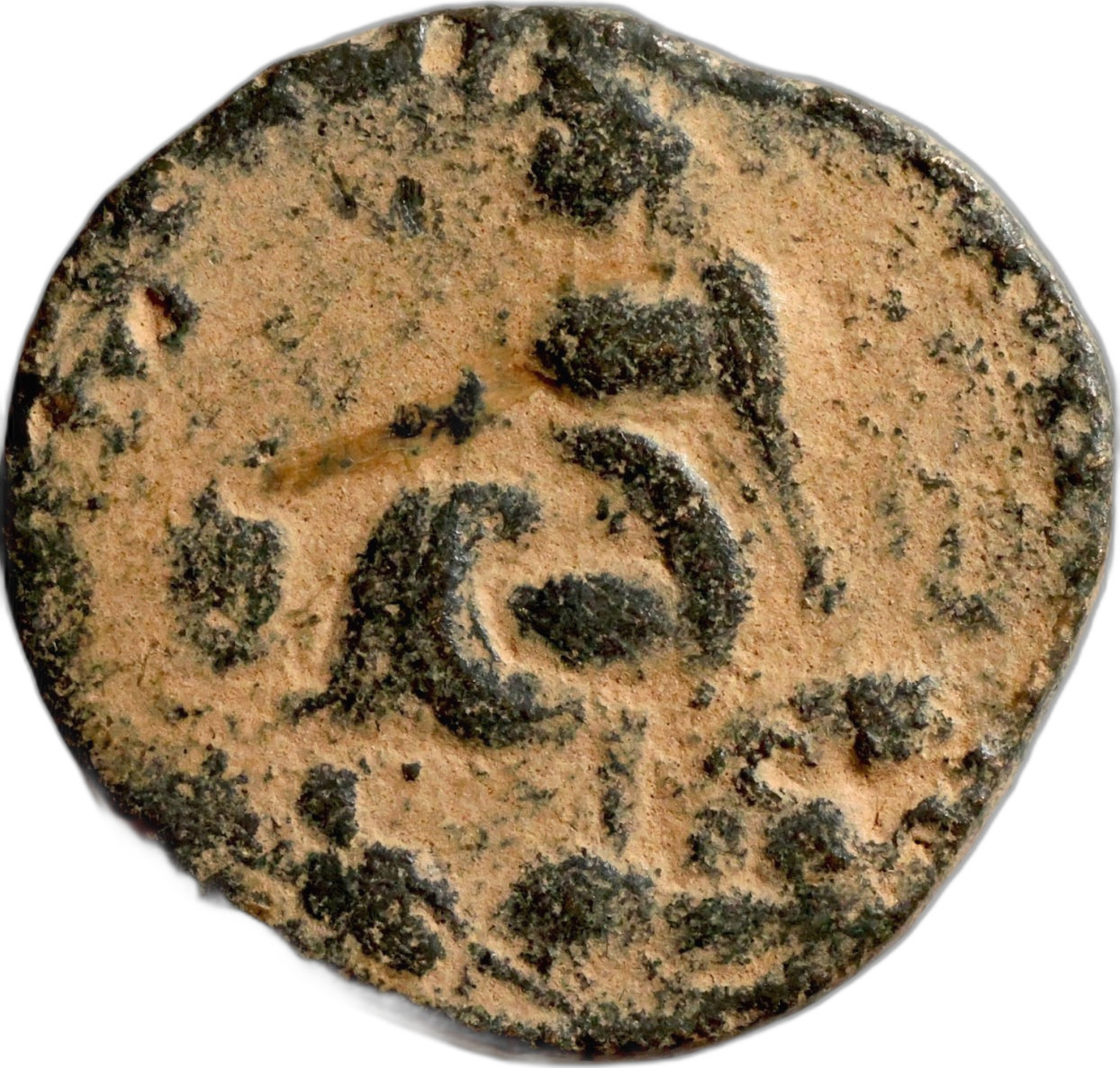 Tyche of the City seated on rock, left, holding corn ears; at her feet, lighted altar; below, river god swimming, left