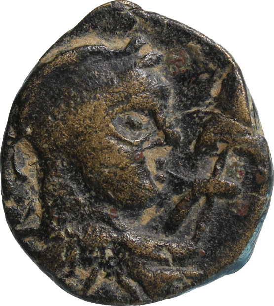 laureate, draped an cuirassed(?) bust of Elagabalus(?), right, holding spear(?), seen from front
