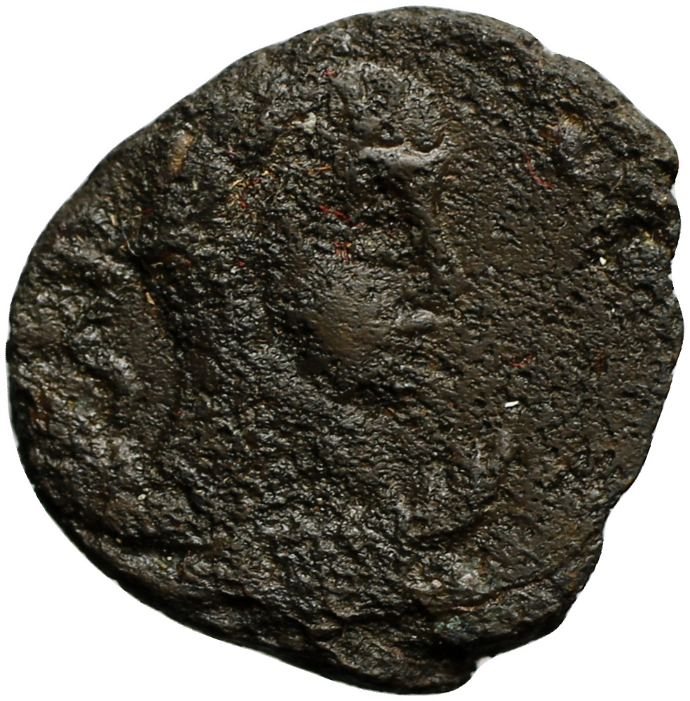 laureate, draped an cuirassed bust of Elagabalus(?), right, holding spear(?), seen from front