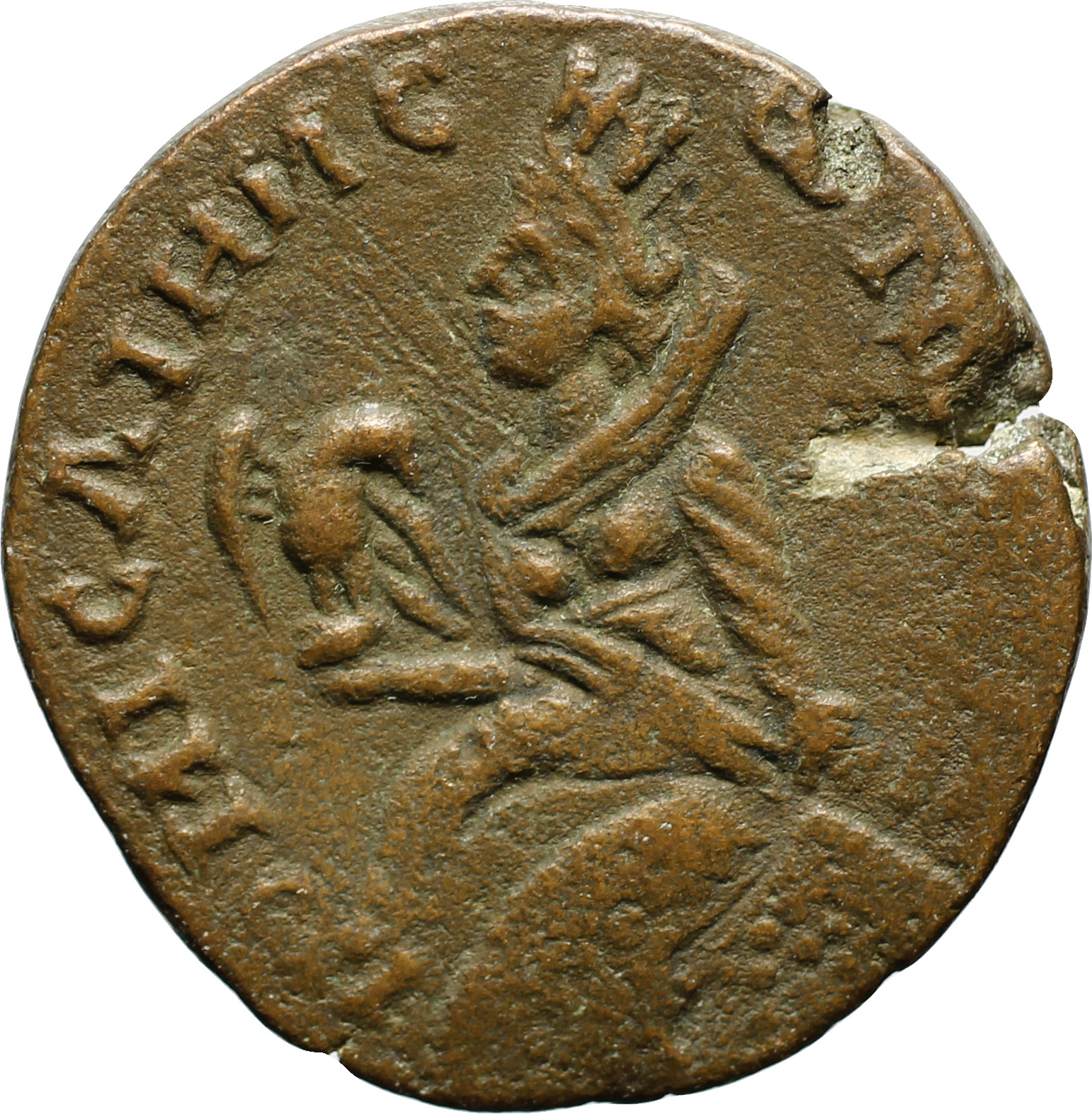 Tyche of the City seated on rock, left, holding eagle looking, right