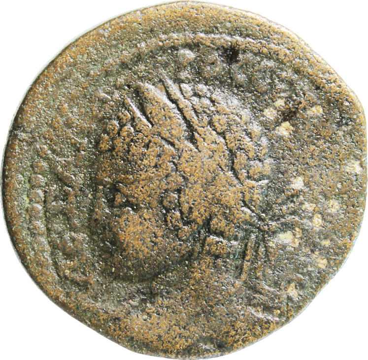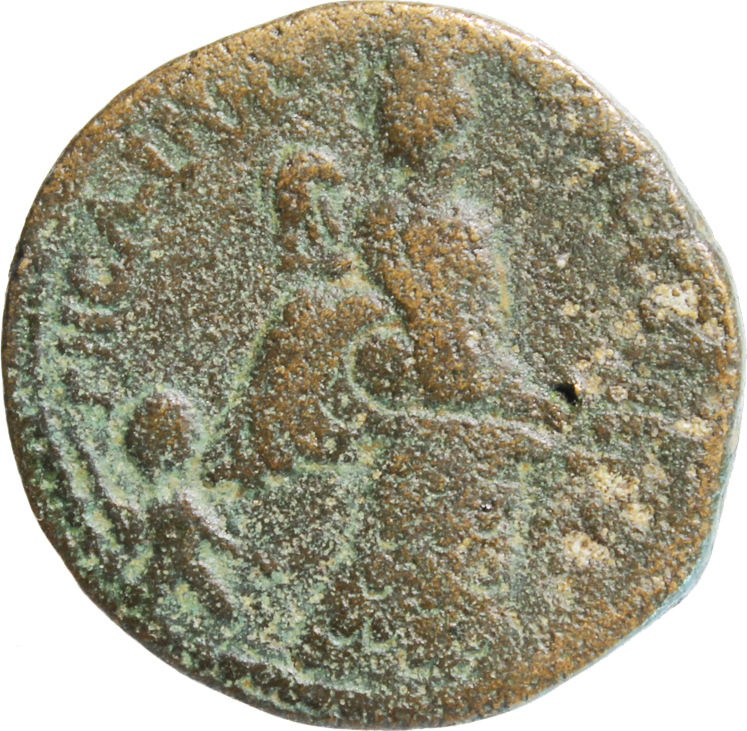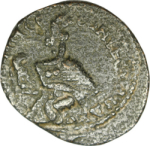 Reverse design Tyche of the City seated on tower(?), left, holding eagle looking, right; at her feet, small figure (river god?), right