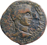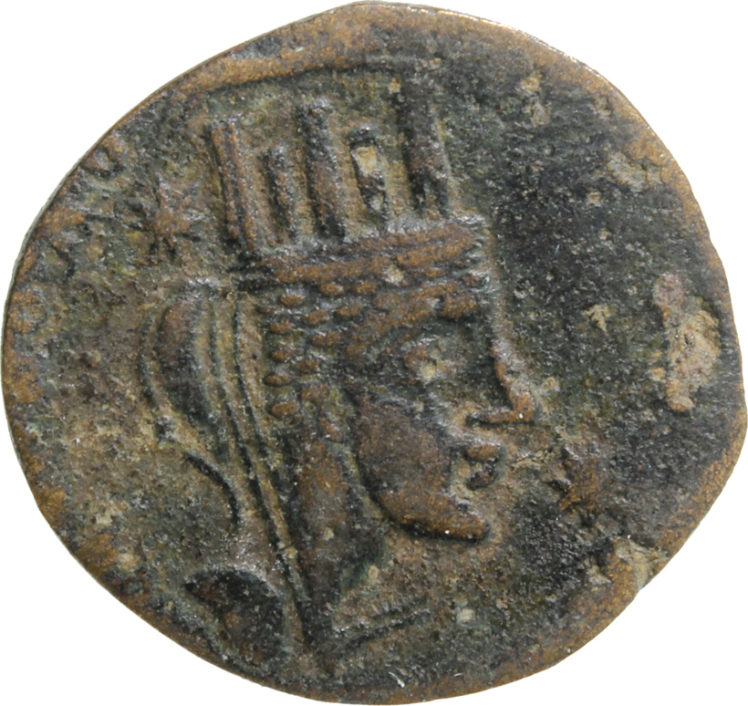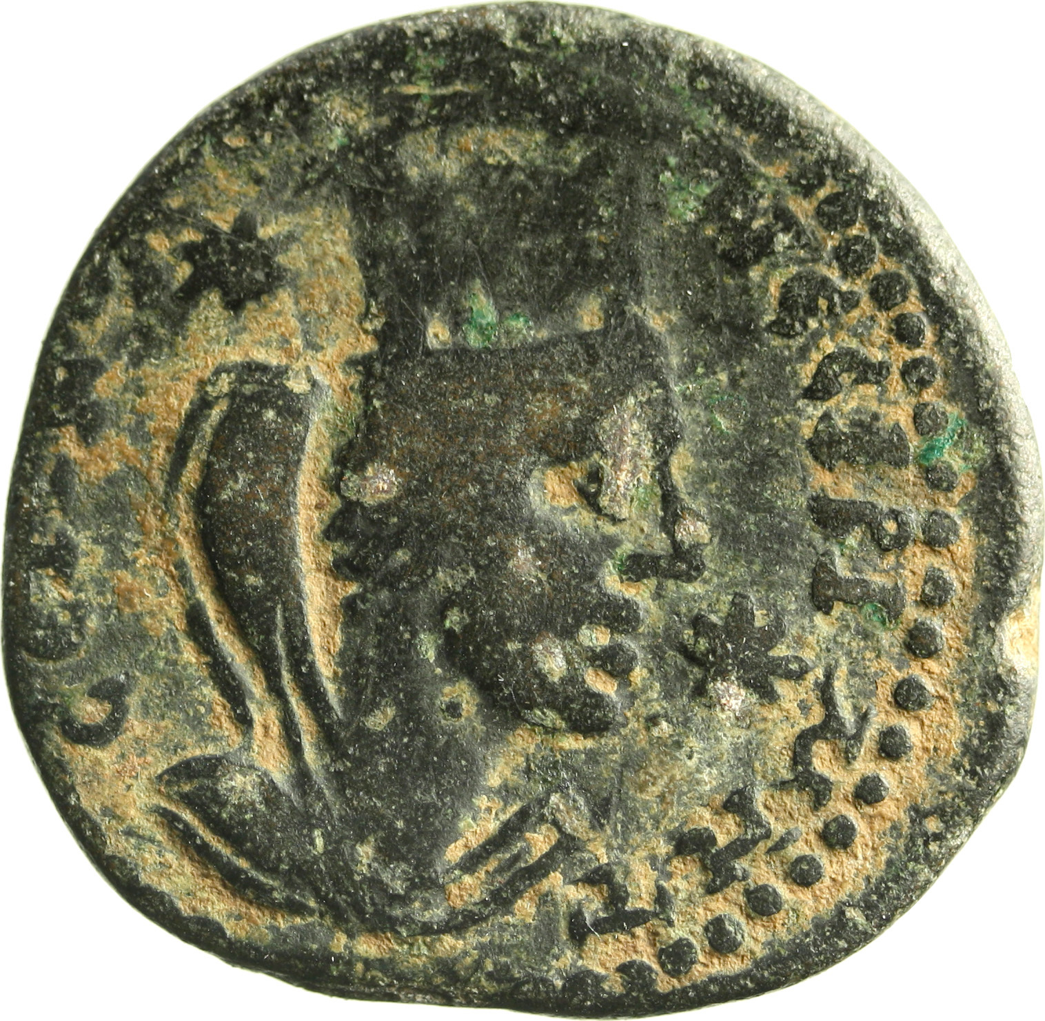 draped, veiled and turreted bust of Tyche, right; before and behind, star; above, ram leaping, right, looking back
