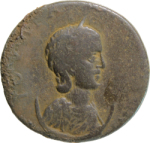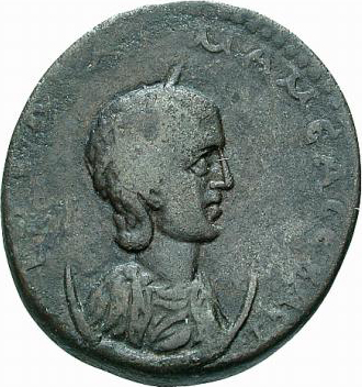 diademed and draped bust of Julia Mamaea, right, on crescent