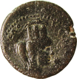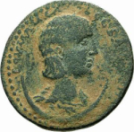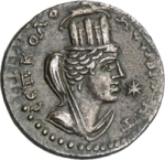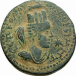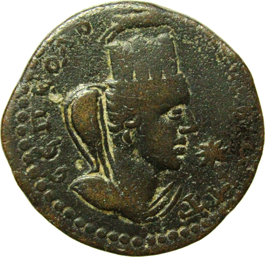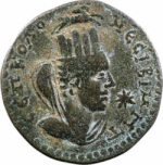 draped, veiled and turreted bust of Tyche, right; before, star; above, ram leaping, right, looking back