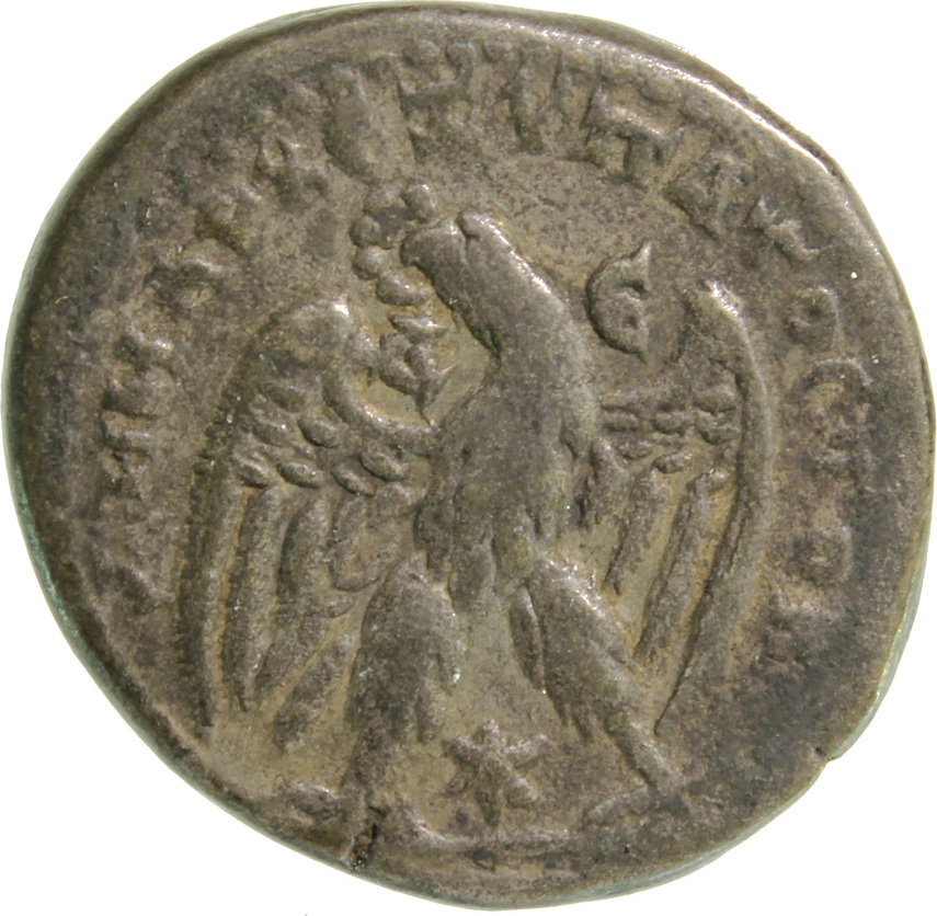 eagle standing right, head left, holding wreath in beak; star between legs |