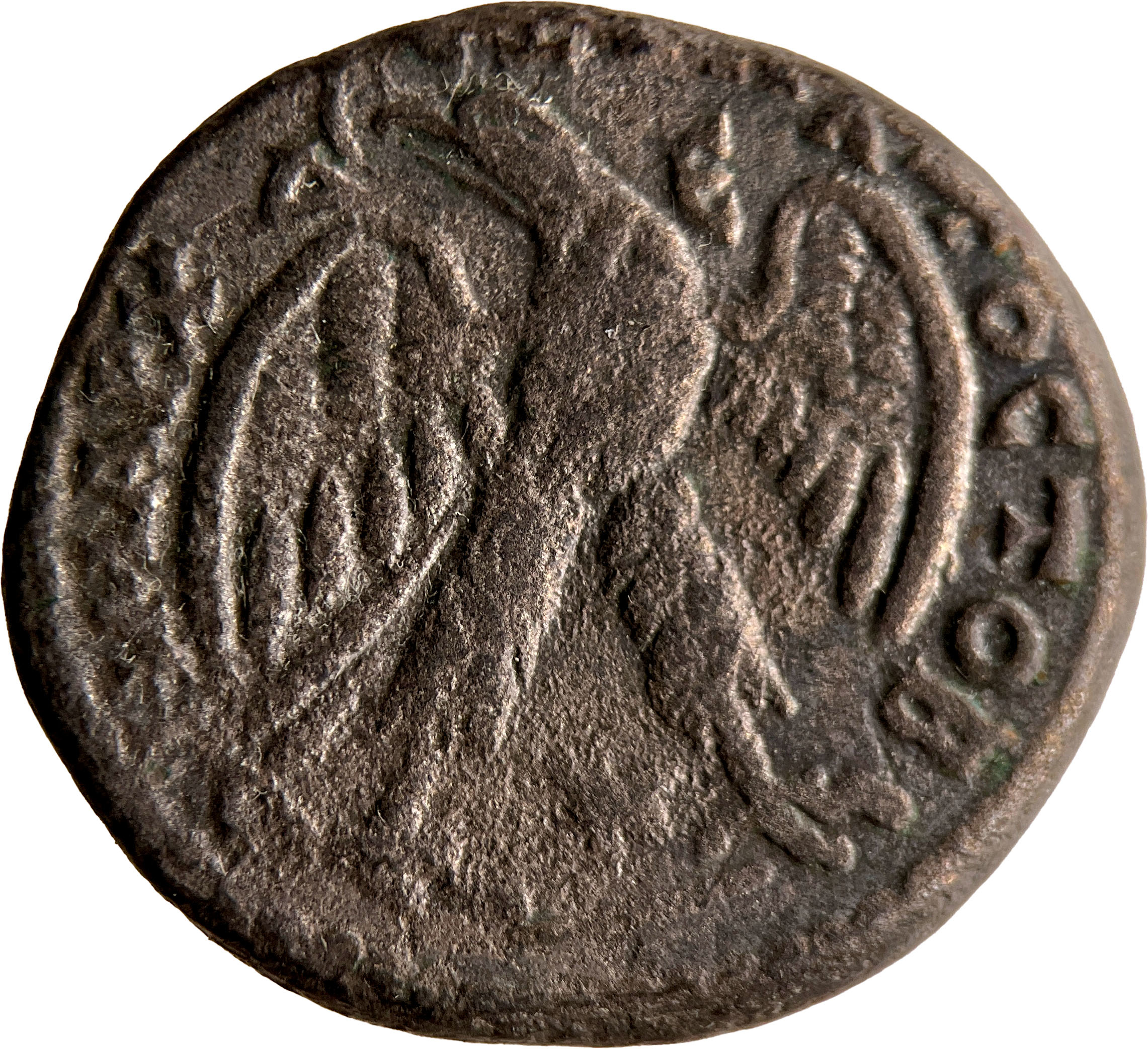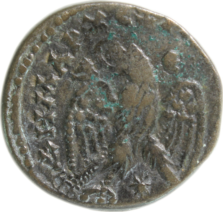 eagle standing facing, head left, holding wreath in beak and spreading wings; star between legs |