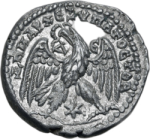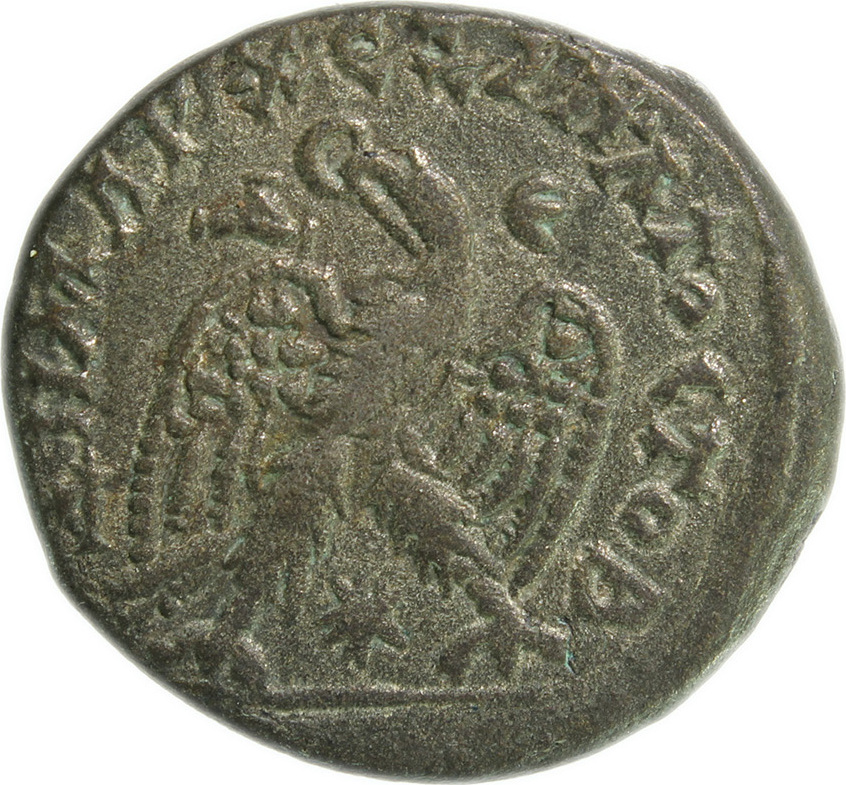 eagle standing facing, head left, holding wreath in beak and spreading wings; star between legs |