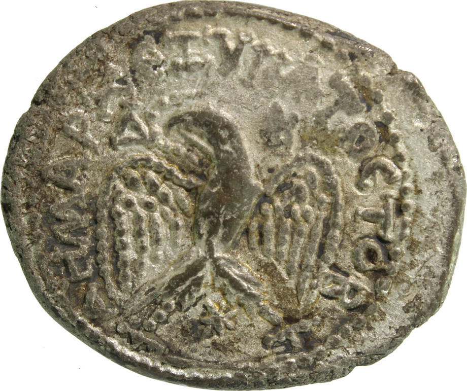 eagle standing facing, head left, holding wreath in beak and spreading wings; star between legs |