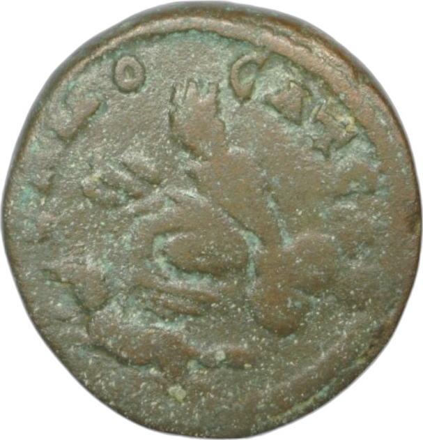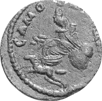 Tyche of the City seated on rock, left, holding corn ears; below, Pegasus flying, left