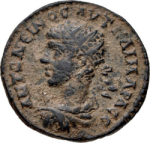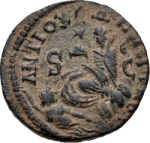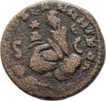 Tyche of the City seated on rock, left, holding corn ears; below, river god Orontes swimming, left, looking back; to left, star |