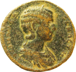 turreted and draped bust of the Tyche of the City, right; above, ram leaping, right, looking back; to left, sometimes crescent or dot |
