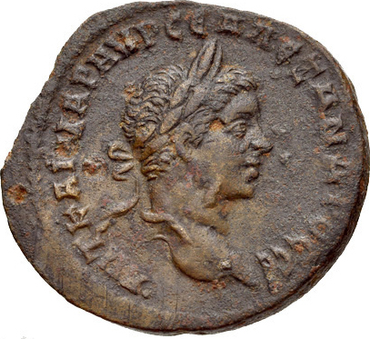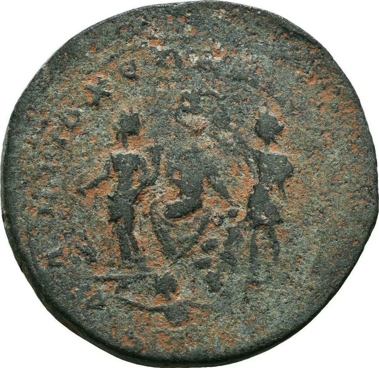 Tyche of the City seated on rock, left, holding corn ears, looking back; at her feet, river god Orontes swimming, left; to left, Tyche standing facing, head right, holding rudder and cornucopia; to right, the Emperor standing, left, holding parazonium and crowning the Tyche of the City |