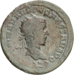 Reverse design Tyche of the City seated on rock, left, holding corn ears, looking back; at her feet, river god Orontes swimming, left; to left, Tyche standing facing, head right, holding rudder and cornucopia; to right, the Emperor standing, left, holding parazonium and crowning the Tyche of the City