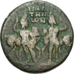 Dioscuri standing facing, looking each other, each wearing Phrygian cap surmounted by star, each resting on spear and being flanked by horse