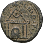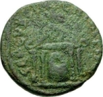 front view of temple with four columns, within which betyl of Zeus Kasios; on roof, eagle; in pediment, star and crescent