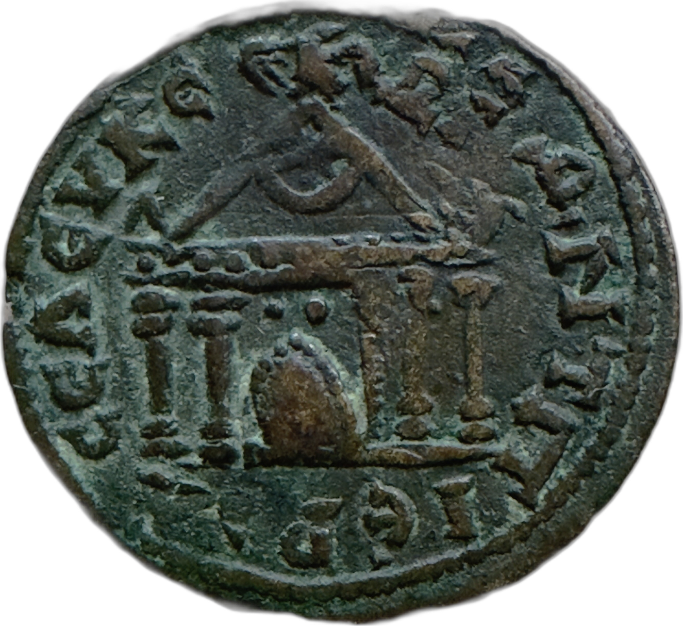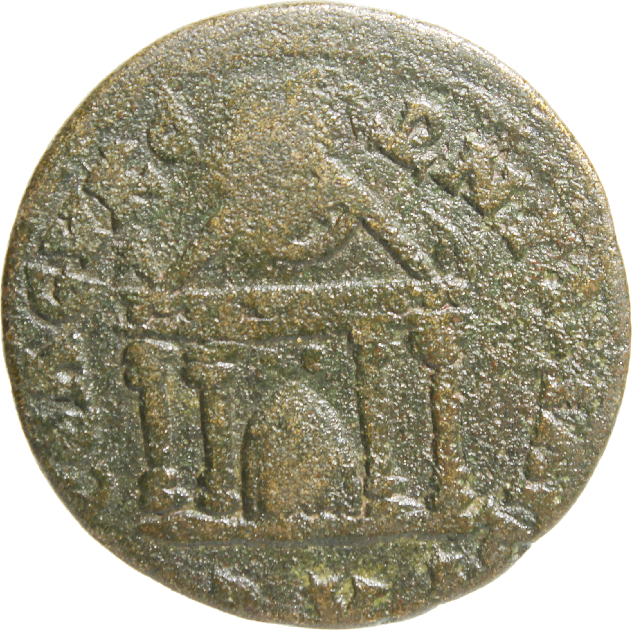 front view of temple with four columns, within which betyl of Zeus Kasios; on roof, eagle; in pediment, sometimes star and crescent