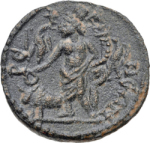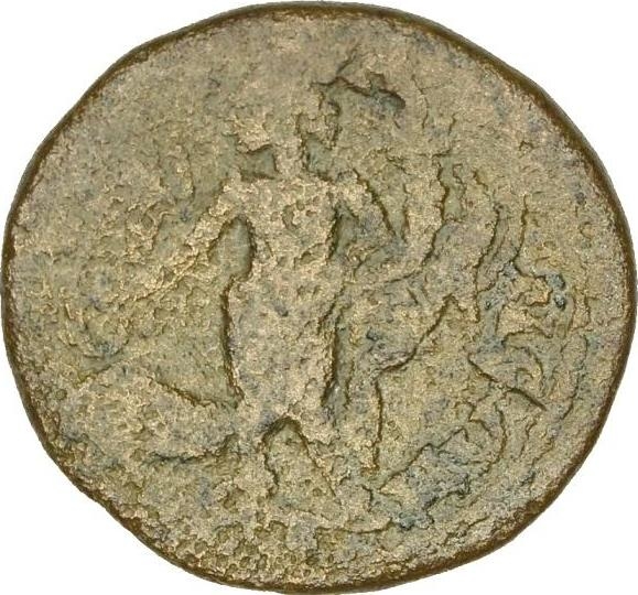 Genius standing facing, head left, wearing kalathos, holding patera and cornucopia; at his feet, bull, left; on either side, eagle
