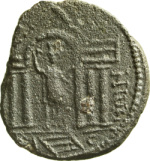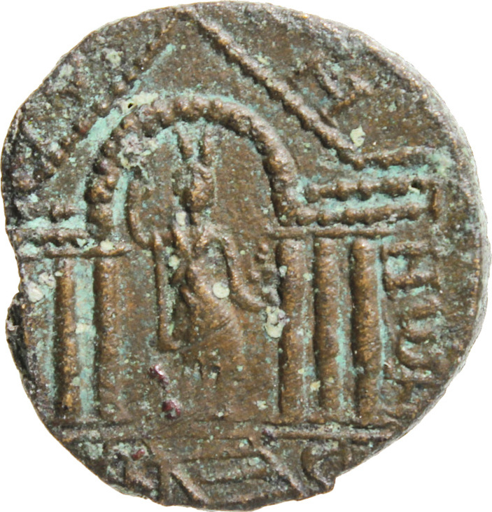 front view of temple with six columns with arcuated lintel in the middle, within which Astarte standing, facing, wearing kalathos, holding long sceptre and four globes; in the exergue, central stairway