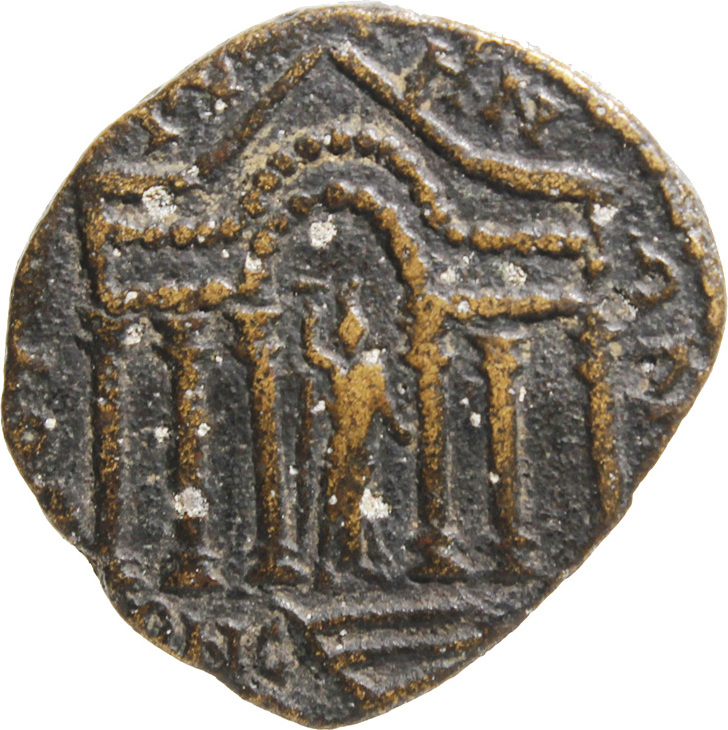 front view of temple with six columns with arcuated lintel in the middle, within which Astarte standing, facing, wearing kalathos, holding long sceptre and two(?) globes; in the exergue, central stairway