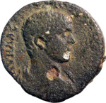 front view of temple with four columns with arcuated lintel, within which Astarte standing, facing, wearing kalathos, resting on long sceptre, crowned by military figure standing, left; in exergue, river god swimming, right, between two stairways |