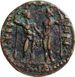 the Dioscuri standing facing, looking each other, each wearing pileus surmounted by star, resting on spear and holding grapes