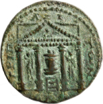 front view of temple with four columns of Zeus Hagios with facing bust of Astarte(?) in the pediment, within which lighted altar in the middle, approached by steps, Helios on the left, standing facing, raising hand, and Selene on the right, standing facing, holding long torch |