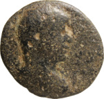 front view of temple with four columns of Zeus Hagios with facing bust of Astarte(?) in the pediment, within which lighted altar in the middle, approached by steps, Helios on the left, standing facing, raising hand, and Selene on the right, standing facing, holding long torch |