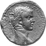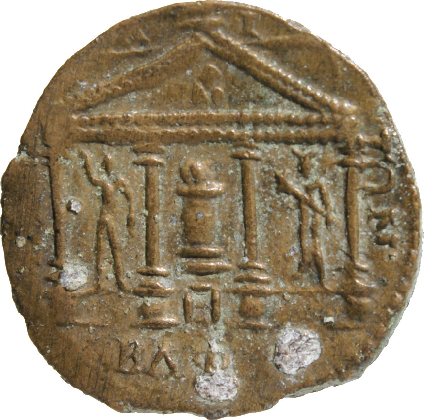 front view of temple with four columns of Zeus Hagios with facing bust of Astarte(?) in the pediment, within which lighted altar in the middle, approached by steps, Helios on the left, standing facing, raising hand, and Selene on the right, standing facing, holding long torch |