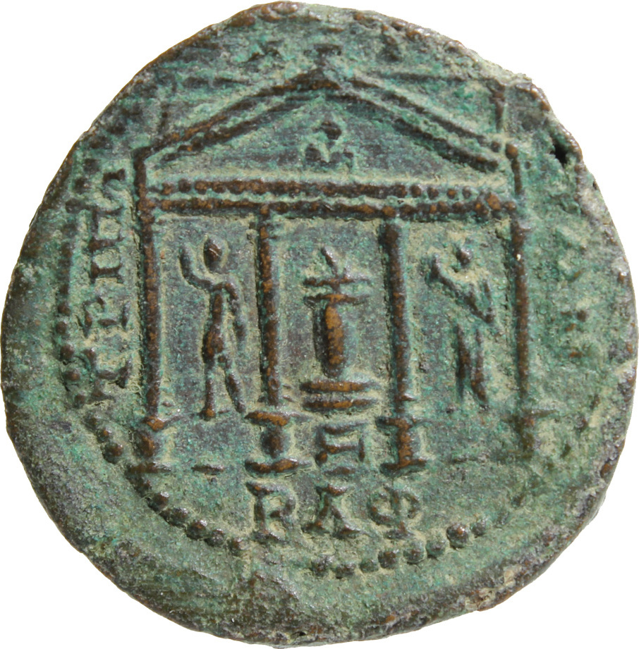 Reverse design front view of temple with four columns of Zeus Hagios with facing bust of Astarte(?) in the pediment, within which lighted altar in the middle, approached by steps, Helios on the left, standing facing, raising hand, and Selene on the right, standing facing, holding long torch