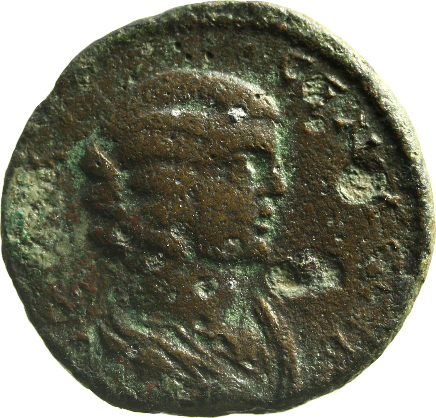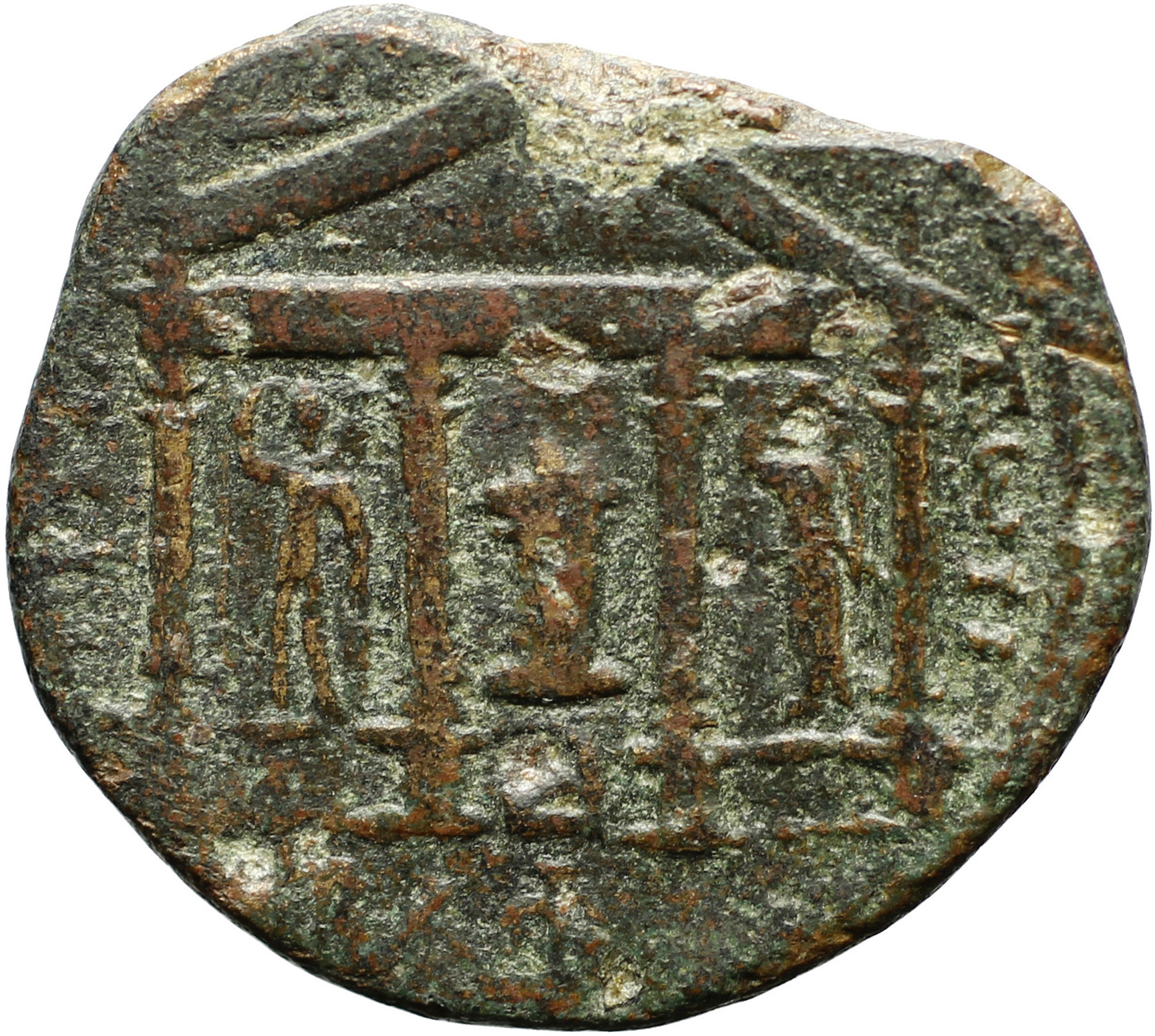 front view of temple with four columns of Zeus Hagios with facing bust of Astarte(?) in the pediment, within which lighted altar in the middle, approached by steps, Helios on the left, standing facing, raising hand, and Selene on the right, standing facing, holding long torch |