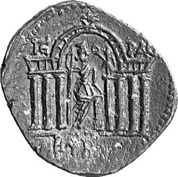 front view of temple with six columns with arcuated lintel in the middle topped by palmette, within which Astarte standing, facing, head right, wearing kalathos, holding long sceptre and placing foot on prow; to right, small Nike standing on column, left, crowning her with wreath |