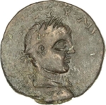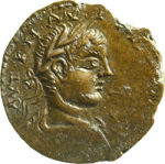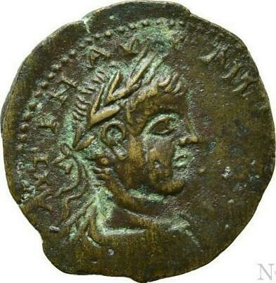 front view of temple with six columns with arcuated lintel in the middle topped by palmette, within which Astarte standing, facing, wearing kalathos, holding long sceptre and placing foot on prow; to right, small Nike standing on column, left, crowning her with wreath |