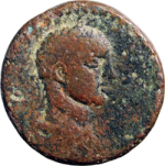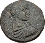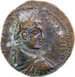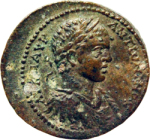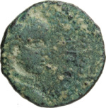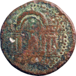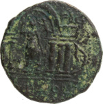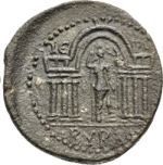 front view of temple with six columns with arcuated lintel in the middle, topped by palmette, within which Astarte standing, facing, head right, wearing kalathos, holding long sceptre and placing foot on prow; to right, small Nike standing on column, left, crowning her with wreath |