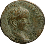 front view of temple with six columns(?) with arcuated lintel in the middle with super-structures, within which Astarte standing, facing, head right, wearing kalathos, holding long sceptre and placing foot on prow; to right, small Nike standing on column, left, crowning her with wreath |
