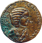 front view of temple with six columns with arcuated and decorated lintel in the middle, within which Astarte standing, facing, head right, wearing kalathos, holding long sceptre and placing foot on prow; to right, small Nike standing on column, left, crowning her with wreath |