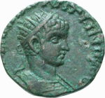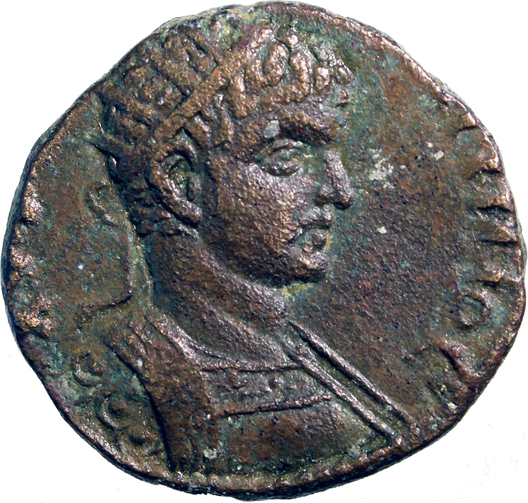 radiate and cuirassed bust of Elagabalus, right, seen from front