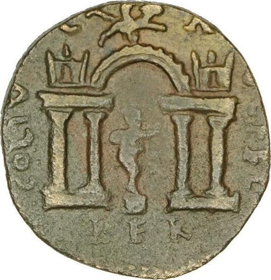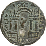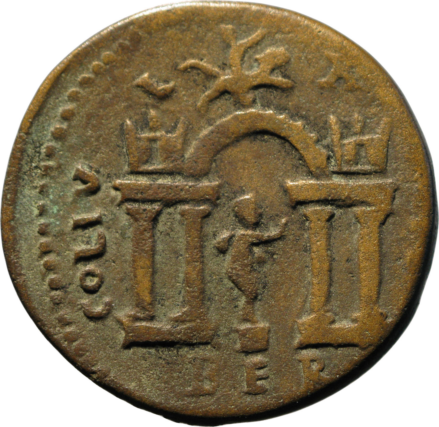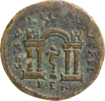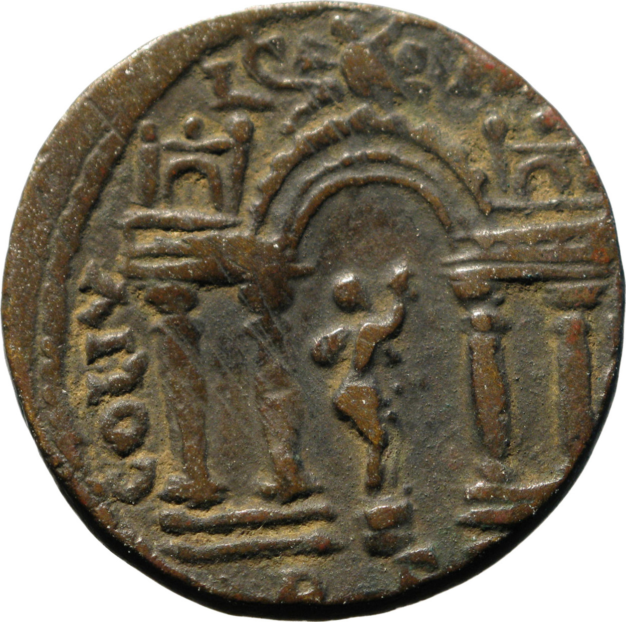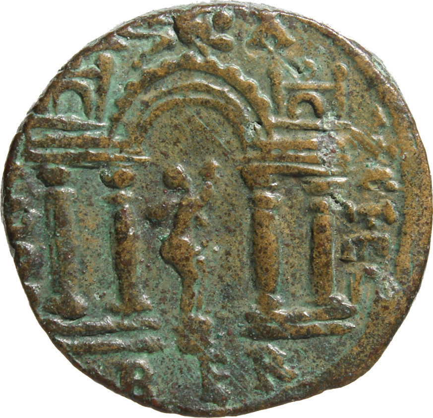 front view of temple with four columns with arcuated lintel surmounted by figure riding lion, right; inside, statue of Marsyas standing, right, holding wineskin over shoulder and raising hand